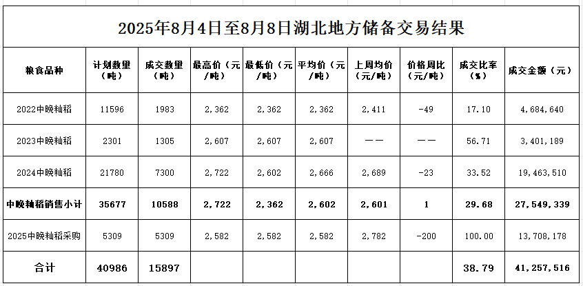 本周湖北地储成交各类粮油15897吨。其中销售:2022年中晚籼稻1983吨,成交率17.1%,成交均价2362元/吨,环比下跌49元/吨;2023年中晚籼稻1305吨,成交率56.71%,成交均价2607元/吨;2024年中晚籼稻7300吨,成交率33.52%,成交均价2666元/吨,环比下跌23元/吨;采购2025年中晚籼稻5309吨,成交率100%,成交均价2582元/吨,环比下跌200元/吨。